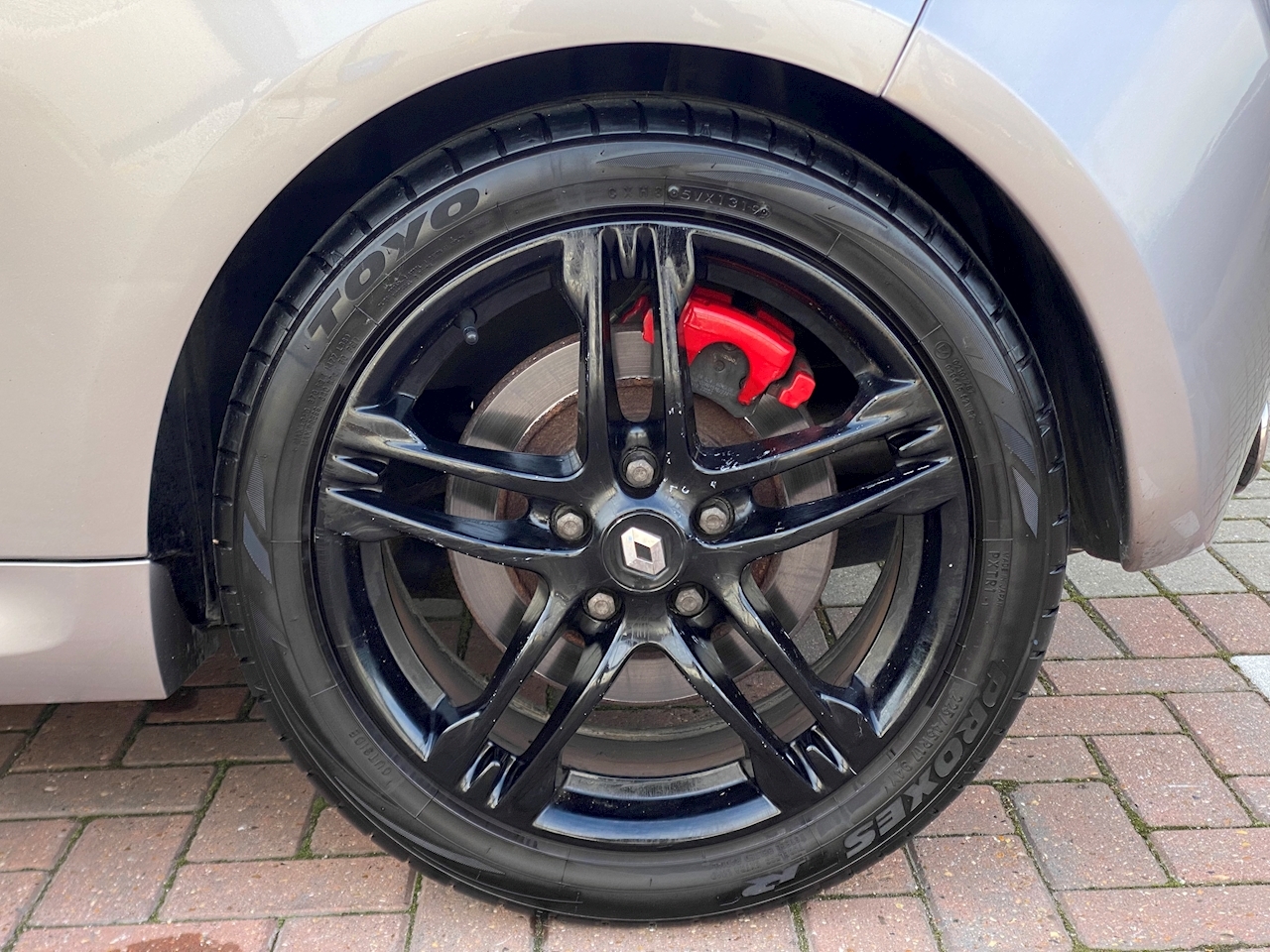 The full specification is as followed, Renaultsport Yellow Dot Recaro Seats, Cup Pack, Metallic Paint, Gloss Black Exterior Pack, Gloss Black 17 Inch Alloy Wheels, Red Brembo Brake Calipers, Automatic Headlights, Automatic Wipers, Climate Control, Air Conditioning, Cruise Control, Rear Privacy Glass, Heated Rear Screen, Electric Windows, Electric Mirrors, 2 Keys, Alcantara Steering Wheel and Gear Gaitor.